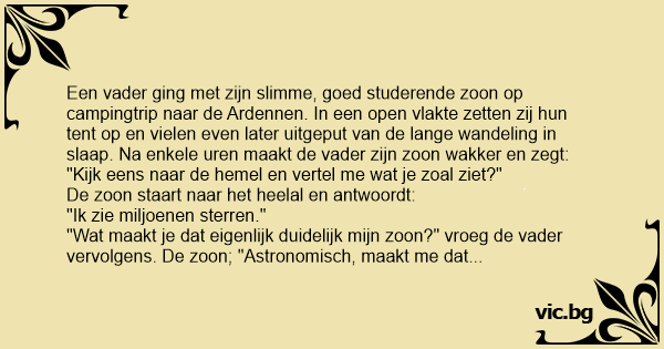 Een vader ging met zijn slimme, goed studerende zoon op campingtrip naar de Ardennen. In een open vlakte zetten zij hun tent op en vielen even later uitgeput van de lange wandeling in slaap. Na enkele uren maakt de vader zijn zoon wakker en zegt: