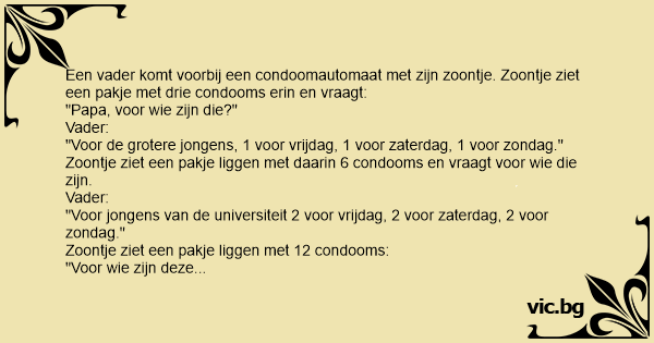 Een vader komt voorbij een condoomautomaat met zijn zoontje. Zoontje ziet een pakje met drie condooms erin en vraagt: