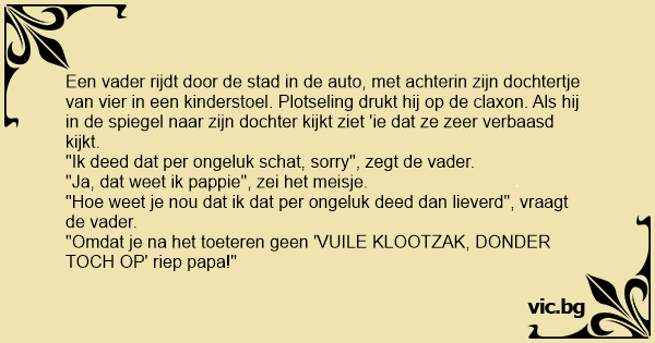 "Omdat je na het toeteren geen 'VUILE КLООТZАК, DONDER TOCH OP' riep papa!"
