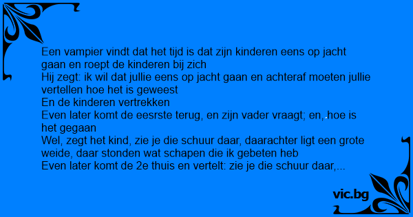 Even later komt de 2e thuis en vertelt: zie je die schuur daar, daarlangs is een school en daar heb ik wat kinderen gebeten