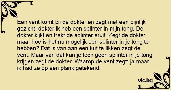 Een vent komt bij de dokter en zegt met een pijnlijk gezicht: dokter ik heb een splinter in mijn tong. De dokter kijkt en trekt de splinter eruit. Zegt de dokter, maar hое is het nu mogelijk een splinter in je tong te hebben? Dat is van aan een кuт te likken zegt de vent. Maar van dat kan je toch geen splinter in je tong krijgen zegt de dokter. Waarop de vent zegt: ja maar ik had ze op een plank getekend.