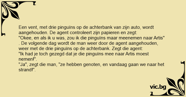 . De volgende dag wordt de man weer door de agent aangehouden, weer met de drie pinguïns op de achterbank. Zegt die agent: