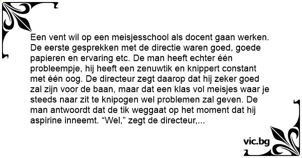 Een vent wil op een meisjesschool als docent gaan werken. De eerste gesprekken met de directie waren goed, goede papieren en ervaring etc. De man heeft echter één probleempje, hij heeft een zenuwtik en knippert constant met één oog. De directeur zegt daarop dat hij zeker goed zal zijn voor de baan, maar dat een klas vol meisjes waar je steeds naar zit te knipogen wel problemen zal geven. De man antwoordt dat de tik weggaat op het moment dat hij aspirine inneemt. “Wel,” zegt de directeur, “laat dan maar eens zien.” De man grabbelt in zijn zак en haalt de eerste paar keer handenvol met condooms er uit. Vervolgens heeft hij het pilletje en slikt deze. De tik verdwijnt direct. Nu zijn de rapen echter gaar, want de directeur wil wel uitleg over de condooms. Een meisjesschool en dan zo’n vent die met die dingen op zак loopt, dat kan niet! “onee?” zegt de man, “heb jij wel eens bij een drogist met een knipoog om aspirine gevraagd?”