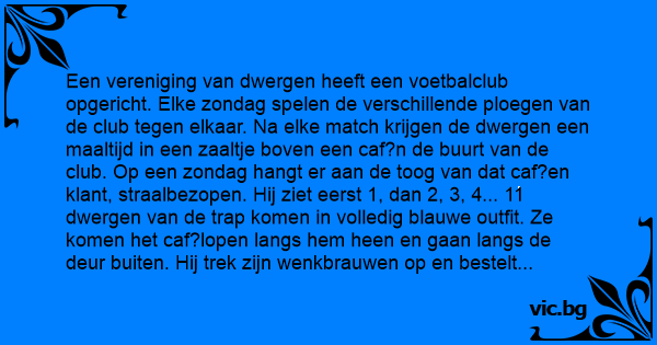 Een vereniging van dwergen heeft een voetbalclub opgericht. Elke zondag spelen de verschillende ploegen van de club tegen elkaar. Na elke match krijgen de dwergen een maaltijd in een zaaltje boven een caf?n de buurt van de club. Op een zondag hangt er aan de toog van dat caf?en klant, straalbezopen. Hij ziet eerst 1, dan 2, 3, 4... 11 dwergen van de trap komen in volledig blauwe outfit. Ze komen het caf?lopen langs hem heen en gaan langs de deur buiten. Hij trek zijn wenkbrauwen op en bestelt nog een whisky. Iets daarna ziet hij eerst 1, dan 2, 3, 4... 11 dwergen in volledige rode outfit van de trap komen. Ook zij komen het caf?innen, lopen langs hem heen en vertrekken langs de deur. Dan roept hij de caf?aas en fluistert hem in het oor: