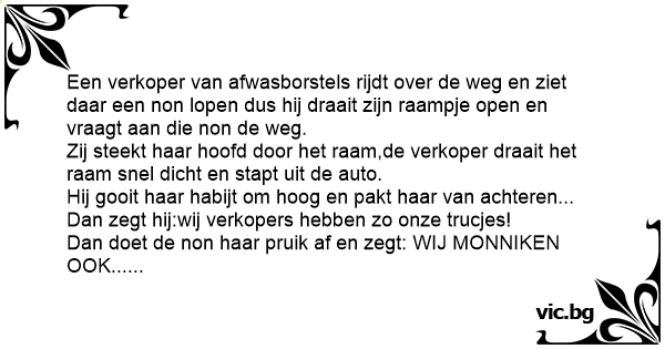 Een verkoper van afwasborstels rijdt over de weg en ziet daar een non lopen dus hij draait zijn raampje open en vraagt aan die non de weg.