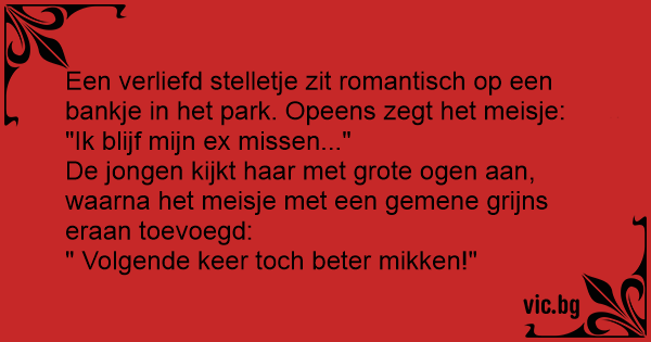 Een verliefd stelletje zit romantisch op een bankje in het park. Opeens zegt het meisje: