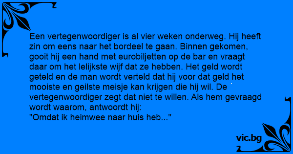 Een vertegenwoordiger is al vier weken onderweg. Hij heeft zin om eens naar het bordeel te gaan. Binnen gekomen, gooit hij een hand met eurobiljetten op de bar en vraagt daar om het lelijkste wijf dat ze hebben. Het geld wordt geteld en de man wordt verteld dat hij voor dat geld het mooiste en geilste meisje kan krijgen die hij wil. De vertegenwoordiger zegt dat niet te willen. Als hem gevraagd wordt waarom, antwoordt hij: "Omdat ik heimwee naar huis heb..."
