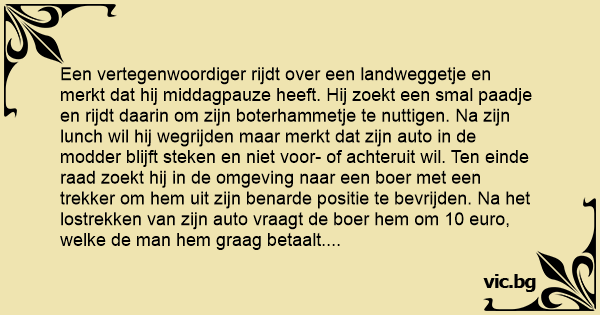 Een vertegenwoordiger rijdt over een landweggetje en merkt dat hij middagpauze heeft. Hij zoekt een smal paadje en rijdt daarin om zijn boterhammetje te nuttigen. Na zijn lunch wil hij wegrijden maar merkt dat zijn auto in de modder blijft steken en niet voor- of achteruit wil. Ten einde raad zoekt hij in de omgeving naar een boer met een trekker om hem uit zijn benarde positie te bevrijden. Na het lostrekken van zijn auto vraagt de boer hem om 10 euro, welke de man hem graag betaalt. Tevreden bedankt de boer hem en zegt dat hij dit dagelijks wel een keer of tien meemaakt. Waarop de vertegenwoordiger vraagt: "Wanneer melk je dan je koeien; 's nachts of zo?" "Nee," zegt de boer, "dan vul ik dit gat met modder.