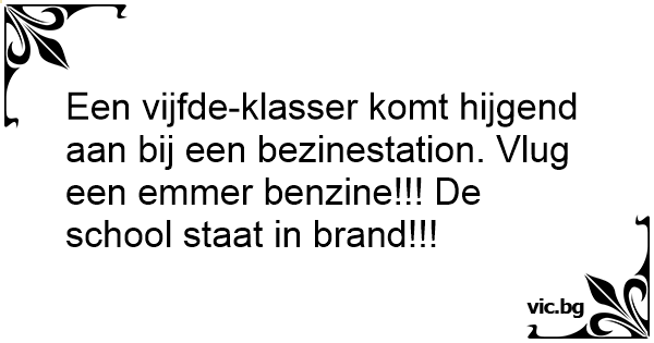 Een vijfde-klasser komt hijgend aan bij een bezinestation. Vlug een emmer benzine!!! De school staat in brand!!!