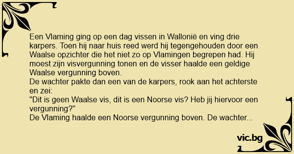 Een Vlaming ging op een dag vissen in Wallonië en ving drie karpers. Toen hij naar huis reed werd hij tegengehouden door een Waalse opzichter die het niet zo op Vlamingen begrepen had. Hij moest zijn visvergunning tonen en de visser haalde een geldige Waalse vergunning boven.