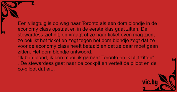 . De stewardess gaat naar de cockpit en vertelt de piloot en de co-piloot dat er een dom blondje in de eerste klas zit, die enkel voor de economy class heeft betaald, en daar niet terug wil gaan zitten. De co-piloot gaat naar het dom blondje toe en probeert haar uit te leggen dat ze enkel voor de economy class heeft betaald en dus niet in de first class mag zitten. Het dom blondje antwoordt: