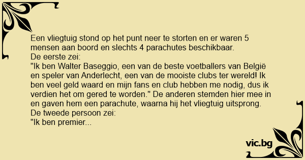 "Ik ben premier Verhofstadt, politicus van de VLD en ik kan mijn land helpen, dus ik denk dat ik gered moet worden." De anderen vonden het ok en gaven hem een parachute. Ook hij sprong uit het vliegtuig.