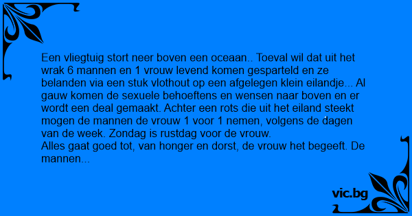 Een vliegtuig stort neer boven een oceaan.. Toeval wil dat uit het wrak 6 mannen en 1 vrouw levend komen gesparteld en ze belanden via een stuk vlothout op een afgelegen klein eilandje... Al gauw komen de sexuele behoeftens en wensen naar boven en er wordt een deal gemaakt. Achter een rots die uit het eiland steekt mogen de mannen de vrouw 1 voor 1 nemen, volgens de dagen van de week. Zondag is rustdag voor de vrouw.