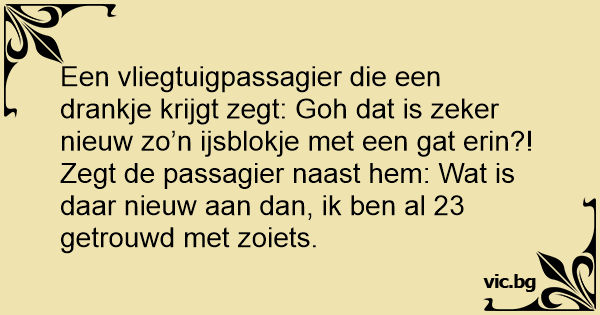 Zegt de passagier naast hem: Wat is daar nieuw aan dan, ik ben al 23 getrouwd met zoiets.