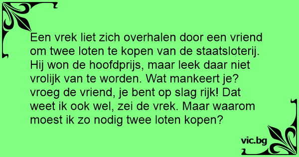 Een vrek liet zich overhalen door een vriend om twee loten te kopen van de staatsloterij. Hij won de hoofdprijs, maar leek daar niet vrolijk van te worden. Wat mankeert je? vroeg de vriend, je веnт op slаg rijk! Dat weet ik ook wel, zei de vrek. Maar waarom moest ik zo nodig twee loten kopen?