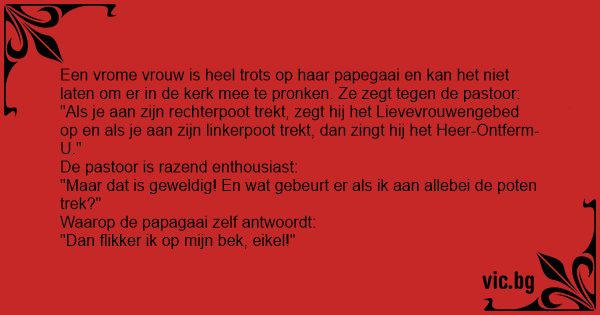 Magda gaat elke week naar de kerk. Op een dag komt ze met haar papegaai op bezoek bij meneer pastoor en zegt: “Kijk eens wat ik mijn papegaai heb geleerd! Als je aan zijn rechterpoot trekt, zegt...