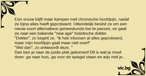 "Dokter", zo begint ze, "ik heb intussen al alles geprobeerd, maar mijn hoofdpijn gaat maar niet over!"