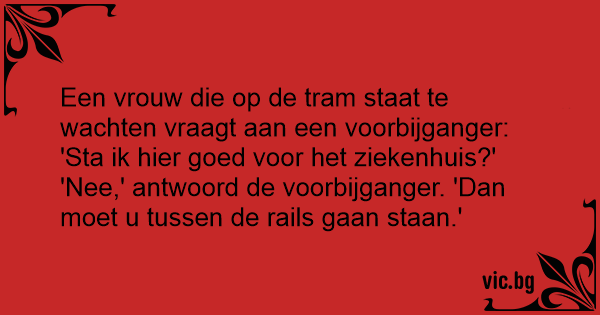 'Nee,' antwoord de voorbijganger. 'Dan moet u tussen de rails gaan staan.'