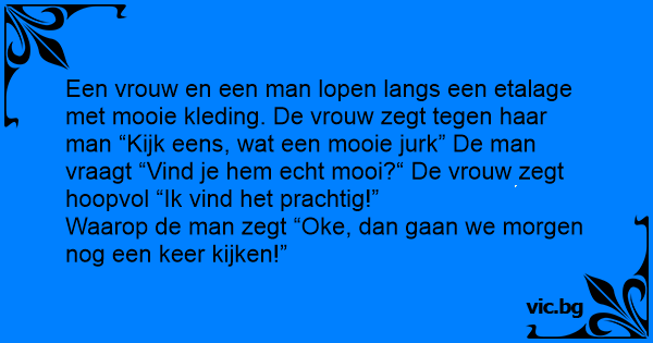 Een vrouw en een man lopen langs een etalage met mooie kleding. De vrouw zegt tegen haar man “Kijk eens, wat een mooie jurk” De man vraagt “Vind je hem echt mooi?“ De vrouw zegt hoopvol “Ik vind het prachtig!”