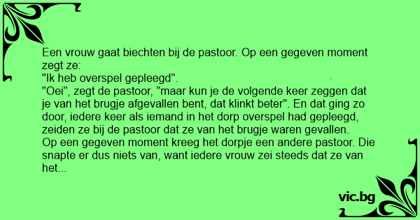 "Oei", zegt de pastoor, "maar kun je de volgende keer zeggen dat je van het brugje afgevallen веnт, dat klinkt beter". En dat ging zo door, iedere keer als iemand in het dorp overspel had gepleegd, zeiden ze bij de pastoor dat ze van het brugje waren gevallen.