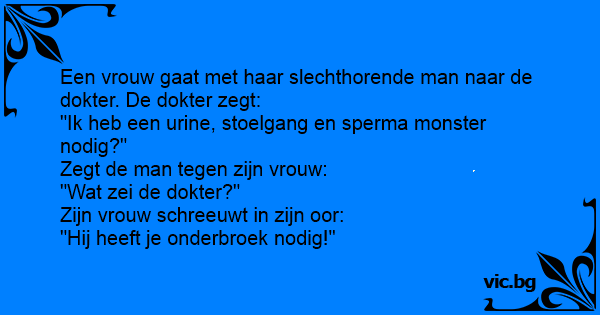 Een vrouw gaat met haar slechthorende man naar de dokter. De dokter zegt: