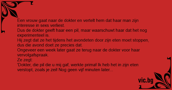 'Dokter, die pil die u mij gaf, werkte prima! Ik heb het in zijn eten verstopt, zoals je zei! Nog geen vijf minuten later sprong hij op, duwde al het eten en de borden op de grond, pakte me vast, rukte al mijn kleren uit en nam me daar meteen op de tafel!
