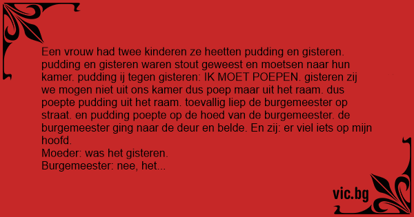 Een vrouw had twee kinderen ze heetten pudding en gisteren. pudding en gisteren waren stout geweest en moetsen naar hun kamer. pudding ij tegen gisteren: IK MOET POEPEN. gisteren zij we mogen niet uit ons kamer dus роер maar uit het raam. dus poepte pudding uit het raam. toevallig liep de burgemeester op straat. en pudding poepte op de hoed van de burgemeester. de burgemeester ging naar de deur en belde. En zij: er viel iets op mijn hoofd.
