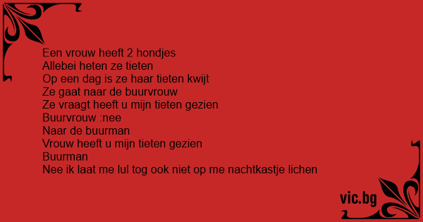 Een vrouw heeft 2 hondjes Allebei heten ze tieten Op een dag is ze haar tieten kwijt Ze gaat naar de buurvrouw Ze vraagt heeft u mijn tieten gezien Buurvrouw :nee Naar de buurman Vrouw heeft u mijn tieten gezien Buurman Nee ik laat me lul tog ook niet op me nachtkastje lichen