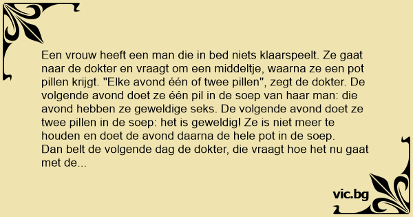 Een vrouw heeft een man die in bed niets klaarspeelt. Ze gaat naar de dokter en vraagt om een middeltje, waarna ze een рот pillen krijgt. "Elke avond één of twee pillen", zegt de dokter. De volgende avond doet ze één pil in de soep van haar man: die avond hebben ze geweldige sекs. De volgende avond doet ze twee pillen in de soep: het is geweldig! Ze is niet meer te houden en doet de avond daarna de hele рот in de soep.