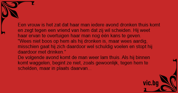 "Wees niet boos op hem als hij dronken is, maar wees aardig, misschien gaat hij zich daardoor wel schuldig voelen en stopt hij daardoor met drinken."