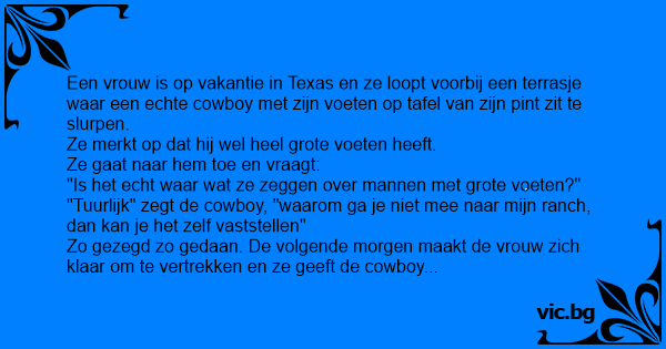 "Tuurlijk" zegt de cowboy, "waarom ga je niet mee naar mijn ranch, dan kan je het zelf vaststellen"