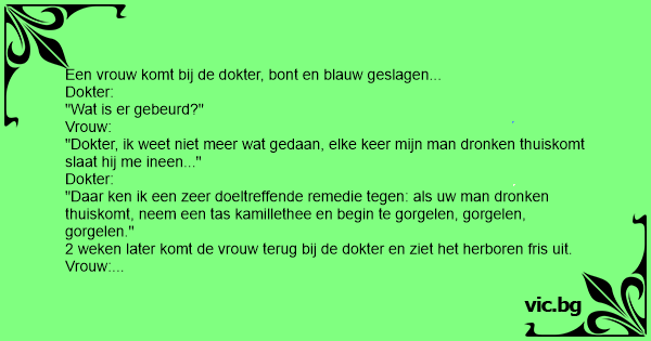 Een vrouw komt bij de dokter, bont en blauw geslagen... Dokter: "Wat is er gebeurd?" Vrouw: "Dokter, ik weet niet meer wat gedaan, elke keer mijn man dronken thuiskomt slaat hij me ineen..." Dokter: "Daar ken ik een zeer doeltreffende remedie tegen: als uw man dronken thuiskomt, neem een tas kamillethee en begin te gorgelen, gorgelen, gorgelen." 2 weken later komt de vrouw terug bij de dokter en ziet het herboren fris uit. Vrouw: "Dokter, dat is een geniale oplossing! Telkens mijn man beschonken thuiskwam en ik kamillethee gorgelde, is er niets gebeurd! Dokter: "Zie je nu hое eenvoudigweg je mond houden helpt?"