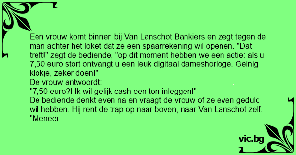 Een vrouw komt binnen bij Van Lanschot Bankiers en zegt tegen de man achter het loket dat ze een spaarrekening wil openen. "Dat treft!" zegt de bediende, "op dit moment hebben we een actie: als u 7,50 euro stort ontvangt u een leuk digitaal dameshorloge. Geinig klokje, zeker doen!"