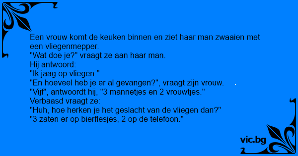 Jantje heeft twee vliegen gevangen en zegt tegen zijn moeder “Volgens mij is het een mannetje en een vrouwtje” Zijn moeder kijk verbaast en vraagt “Hoe kan je dat nou weten Jantje?” Waarop Jantje...