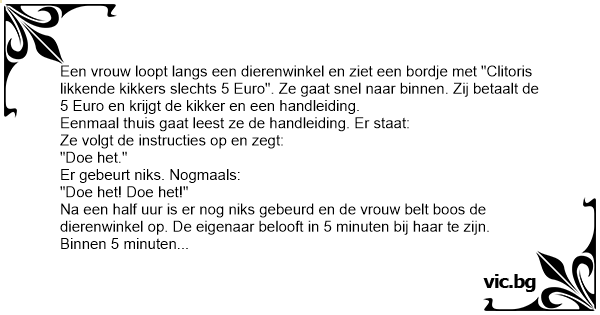Een vrouw loopt langs een dierenwinkel en ziet een bordje met "Сliтоris likkende kikkers slechts 5 Euro". Ze gaat snel naar binnen. Zij betaalt de 5 Euro en krijgt de kikker en een handleiding.