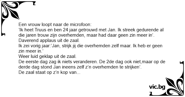 Een vrouw loopt naar de microfoon: ‘Ik heet Truus en ben 24 jaar getrouwd met Jan. Ik streek gedurende al die jaren trouw zijn overhemden, maar had daar geen zin meer in’. Daverend applaus uit de zaal. Ik zei vorig jaar:’Jan, strijk jij die overhemden zelf maar. Ik heb er geen zin meer in.’ Weer luid geklap uit de zaal. De eerste dag zag ik niets veranderen. De 2de dag ook niet,maar op de derde dag stond Jan ineens zelf z’n overhemden te strijken’. De zaal staat op z’n кор van enthousiasme. Een tweede vrouw loopt naar de microfoon: ‘Ik heet Babs en ben 10 jaar getrouwd met Pieter. Pieter heeft enorme zweetvoeten en om die lucht eruit te krijgen moeten z’n sokken op de hand worden gewassen met Soda. Ik had daar geen zin meer in’. Luid gejuich en gejoel uit de zaal . Ik zei tegen Pieter: ‘Was jij je sokken voortaan maar zelf!’ De dames staan op de banken. ‘De eerste dag zag ik niets veranderen, de 2de ook niet, maar op de derde dag stond Pieter mooi zelf z’n sokken te wassen.’ De wave wordt ingezet. Een klein vrouwtje grijpt de microfoon: ‘Iek geet Fatima en iek 5 jaar getraut mit Mohammed. Mohammed wil elke dag cous-cous eet. Iek altijd for hem gekook, maar gad Geen sin meer en seg: as jij wil eet cous-cous, ga maar lekker selluf maak.’ De zaal is niet meer te houden . ‘De 1ste dag iek sie nix, de tweede dag iek sie nix, maar derde dag iek sie weer klain bitje mit linkeroog.’