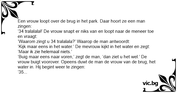 ‘Buig maar eens naar voren,’ zegt de man, ‘dan ziet u het wel.’ De vrouw buigt voorover. Opeens duwt de man de vrouw van de brug, het water in. Hij begint weer te zingen: