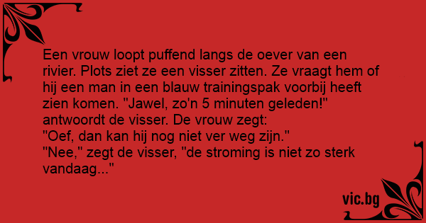 Een vrouw loopt puffend langs de oever van een rivier. Plots ziet ze een visser zitten. Ze vraagt hem of hij een man in een blauw trainingspak voorbij heeft zien komen. "Jawel, zo'n 5 minuten geleden!" antwoordt de visser. De vrouw zegt: