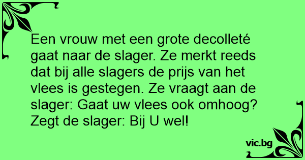 Een vrouw met een grote decolleté gaat naar de slager. Ze merkt reeds dat bij alle slagers de prijs van het vlees is gestegen. Ze vraagt aan de slager: Gaat uw vlees ook omhoog? Zegt de slager: Bij U wel!