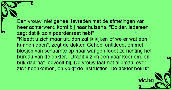 "Kleedt u zich maar uit, dan zal ik kijken of we er wat aan kunnen doen", zegt de dokter. Geheel ontkleed, en met blosjes van schaamte op haar wangen loopt ze richting het bureau van de dokter. "Draait u zich een paar keer om, en buk daarna" ,beveelt hij. De vrouw laat het allemaal over zich heenkomen, en volgt de instructies. De dokter bekijkt de immense vleesmassa, en begint zonder een woord te zeggen wild te schrijven. "'Oh dokter, gaat u nu een receptje uitschrijven?"