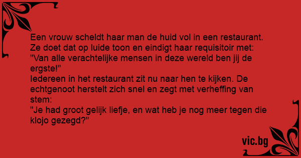 Iedereen in het restaurant zit nu naar hen te kijken. De echtgenoot herstelt zich snel en zegt met verheffing van stem:
