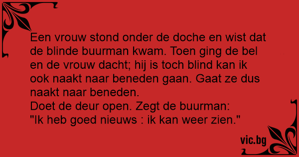 Een vrouw stond onder de doche en wist dat de blinde buurman kwam. Toen ging de bel en de vrouw dacht; hij is toch blind kan ik ook naakt naar beneden gaan. Gaat ze dus naakt naar beneden.