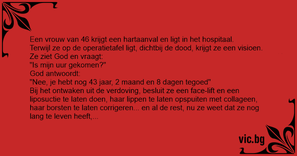 Eine mittelalte Frau hatte einen Herzanfall und wurde zum Spital gebracht. Wie sie am Operationstisch lag, hatte sie eine "Todesnahe Erfahrung". Sie sieht Gott und fragt ihn: "Ist mein Leben aus?" Gott sagt: "Nein, du hast noch 43 Jahre, 2 Monate und 8 Tage zum Leben." Nach der Herzoperation...