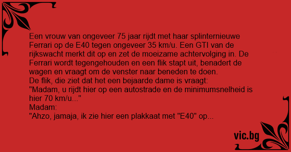 Een dame van rond de 75 jaar rijdt met haar splinternieuwe Ferrari op de A67 ongeveer 66 km/h. Een stel agenten in een politie busje merken dit op en zetten de dame bij de eerstvolgende afrit aan...