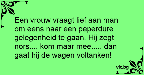 Een vrouw vraagt lief aan man om eens naar een peperdure gelegenheid te gaan. Hij zegt nors.... kom maar mee..... dan gaat hij de wagen voltanken!