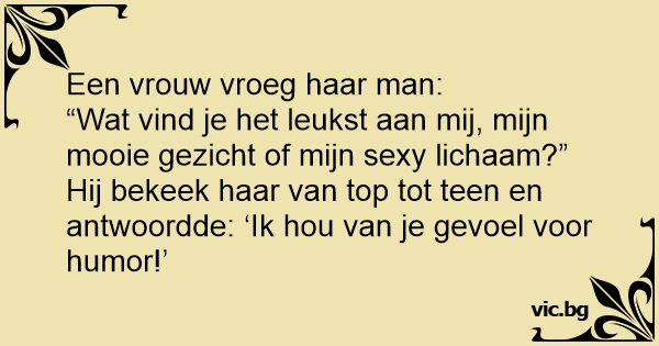 Hij bekeek haar van top tot teen en antwoordde: ‘Ik hou van je gevoel voor humor!’