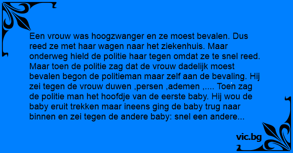 Een vrouw was hoogzwanger en ze moest bevalen. Dus reed ze met haar wagen naar het ziekenhuis. Maar onderweg hield de politie haar tegen omdat ze te snel reed. Maar toen de politie zag dat de vrouw dadelijk moest bevalen begon de politieman maar zelf aan de bevaling. Hij zei tegen de vrouw duwen ,persen ,ademen ,.... Toen zag de politie man het hoofdje van de eerste baby. Hij wou de baby eruit trekken maar ineens ging de baby trug naar binnen en zei tegen de andere baby: snel een andere uitgang zoeken de politie staat voor de deur.