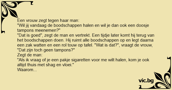 "Dat is goed", zegt de man en vertrekt. Een tijdje later komt hij terug van het boodschappen doen. Hij ruimt alle boodschappen op en legt daarna een zак watten en een rol touw op tafel. "Wat is dat?", vraagt de vrouw, "Dat zijn toch geen tampons?"