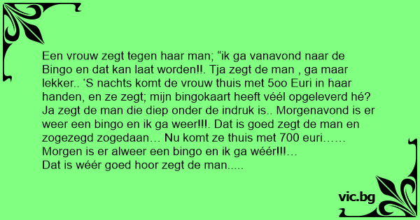 Een vrouw zegt tegen haar man; “ik ga vanavond naar de Bingo en dat kan laat worden!!. Tja zegt de man , ga maar lekker.. ‘S nachts komt de vrouw thuis met 5oo Euri in haar handen, en ze zegt; mijn bingokaart heeft véél opgeleverd hé? Ja zegt de man die diep onder de indruk is.. Morgenavond is er weer een bingo en ik ga weer!!!. Dat is goed zegt de man en zogezegd zogedaan… Nu komt ze thuis met 700 euri…… Morgen is er alweer een bingo en ik ga wéér!!!…
