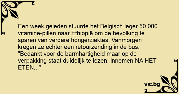 Een week geleden stuurde het Belgisch leger 50 000 vitamine-pillen naar Ethiopië om de bevolking te sparen van verdere hongerziektes. Vanmorgen kregen ze echter een retourzending in de bus: